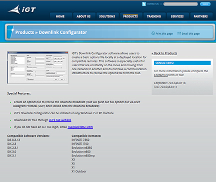 ...iGT Downlink Configurator free of charge to enable users to create a basic options file locally at a deployed location for compatible remotes. This software is especially useful for users who are moving from one network to another without having a communications infrastructure to receive an options file from the hub. Features include...