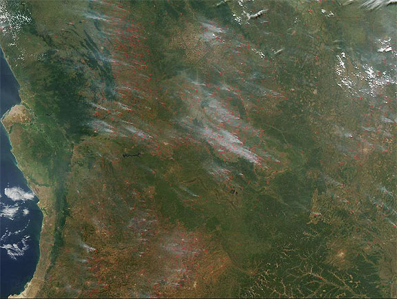 This recent NASA satellite imagery, from June 2 at 12:40 UTC (8:40 a.m. EDT), reveals hundreds of fires burning in northwestern Angola, and in the southern part of the Democratic Republic of the Congo (located north of Angola). That's when NASA's Aqua satellite flew overhead and the Moderate Resolution Imaging Spectroradiometer (MODIS) instrument indentified fires and the smoke streaming from them in a visible image. The red dots in the image are hotspots associated with unusually high surface temperatures characteristic of fires. Some of the fires were burning in the Reserva Especial do Milando and the Reserva Natural Integral do Luando, located in the north and north central part of the country. Other fires were likely set for agricultural purposes to manage crops and pastures, which is a common practice in this region.