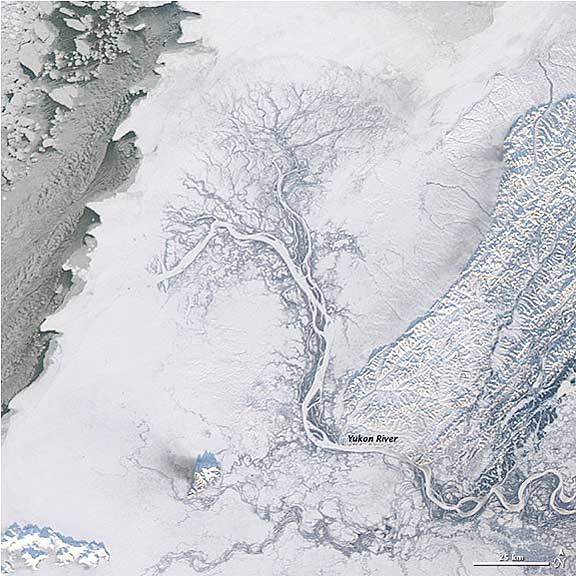 Nature works in patterns, and one of those patterns is imprinted on the frozen Alaskan landscape in this true-color image from January 11, 2010. Like a winter-bare tree, a network of roots, or the veins, arteries, and capillaries that enclose an organ, the Yukon River branches across the snowy Yukon Delta to the Bering Sea.