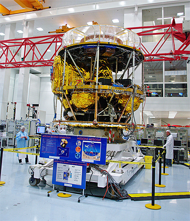 MSG-3 in its white room in Cannes. Without the solar array that usually surrounds the craft, the satellite’s internal structure with the Seviri imager in the central cone can be seen, the baffle plate being on the left. The spheres are tanks containing propellant used for the geostationary transfer and maintaining the satellite in its operating position.