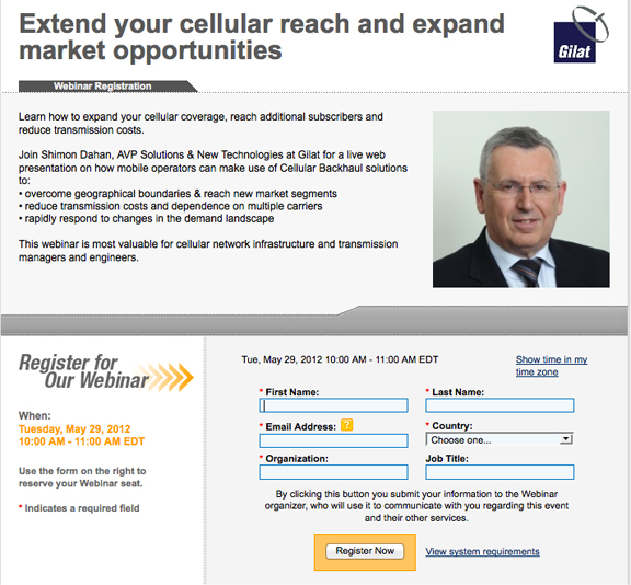 This webinar, entitled "Extend Your Cellular Reach and Expand Market Opportunities," is most valuable for cellular network infrastructure and transmission managers and engineers. The webinar will be held on Tuesday, May 29th, 2012, from 10:00 a.m. to 11:00 a.m., EDT.