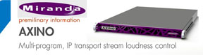 - Miranda Technologies has expanded its range of headend monitoring and signal processing solutions with its new Axino multi-program, IP transport stream loudness control processor. The new processor addresses all common loudness problems using Automatic Loudness Control, including excessive channel-to-channel and program-to-program variation. For instance, when installed downstream of the advertisement insertion equipment, it will prevent excessively loud commercials, and will improve the quality of service for subscribers. Axino can process multiple audio services, including Dolby Digital (AC3), from a single or multiple programs carried over IP. The audio services are extracted, measured, processed for loudness, and remuxed into the original program. The processor ensures that the audio loudness matches the desired target by constantly measuring the levels, using ITU-R BS.1770, and then applying real-time audio level correction. The result is a smooth and consistent audio loudness at all times, and across all television channels. To assist with compliance, Axino logs measured loudness across all the processed channels. These logs can be viewed and the contents analyzed to identify any problematic audio segments. They can also provide proof of loudness monitoring and control activities.