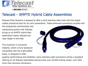 - At NAB 2011, Telecast Fiber Systems will introduce a new line of SMPTE cable assemblies specifically designed to meet the demands of HDTV broadcasting. The heavy-duty, stainless steel assemblies offer high levels of performance, reliability, and durability for fiber connectivity between HD cameras and camera control units, in studio as well as outside broadcasting configurations. The new SMPTE cable assemblies are equipped with heavy-duty SMPTE 304M hybrid fiber connectors with solid stainless steel shells covered with a full-length rubber strain-relief boot to protect the connector from the rigors of outside broadcasting. The assemblies are fully backward-compatible with triple-plated brass connectors, and are rated for more than 20,000 mating cycles — a 50 percent increase over previous assemblies. Highly durable, the assemblies can survive a two-meter drop onto concrete. The innovative design is a direct result of new synergy between Telecast Fiber Systems and Belden, Telecast's new corporate parent.