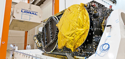 ...in full swing, with this upcoming flight’s two telecommunications relay platforms—Amazonas 3 and Azerspace/Africasat-1a— undergoing their checkout procedures at the Spaceport. The Amazonas 3 spacecraft began its pre-launch activity inside the Spaceport’s S1B clean room facility, following an arrival in French Guiana earlier this month aboard a chartered cargo jetliner. Amazonas 3 will have a liftoff mass of 6.2 metric tons, and carries Ka-, Ku- and C-band transponders for telecommunications services across the Americas, along with Europe and North Africa. Its Ka-band payload positions the HISPASAT Group as Latin America’s first operator capable of offering interactive services and multimedia applications via satellite to a large number of users. The spacecraft was built by Space Systems/Loral in Palo Alto, California, based on the company’s 1300-series platform. To be positioned at an orbital location of 61 degrees West, it will deliver services that include direct-to-home television, corporate fixed and mobile telephone networks and broadband.