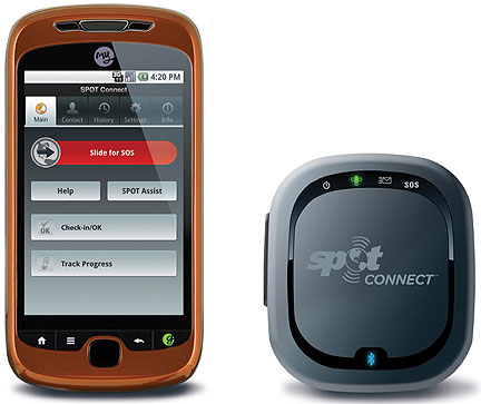 Today's smartphones provide mobile social connection. Now when users go off-grid, their smartphone can continue to be of assistance. SPOT Connect provides connectivity to global communication satellites for sending location-based messages from around town or areas outside of cellular phone coverage. By simply downloading the SPOT Connect app, SPOT Connect wirelessly synchs via Bluetooth with smartphone operating systems such as Android. SPOT message features are then initiated using the SPOT Connect app on the smart device.
