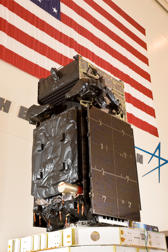 The first SBIRS geosynchronous (GEO-1) spacecraft stands ready to be lowered into its shipping container in preparation for its delivery to Cape Canaveral Air Force Station, Florida, for launch. Photo courtesy of Lockheed Martin.
