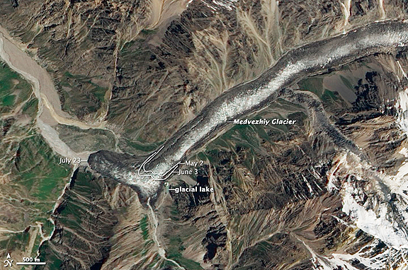 The Advanced Land Imager (ALI) on NASA’s Earth Observing-1 (EO-1) satellite captured this natural-color image of Medvezhiy Glacier on July 23, 2011. Annotations mark the position of the glacier terminus on May 2, June 3, and July 23, 2011. Located in southern Tajikistan in the Pamir Mountains, Medvezhiy (Bear) Glacier is roughly 16 kilometers long, and drains out of the Academii Nauk (Academy of Sciences) Range. The upper end of Medvezhiy sits 4,500 meters above sea level, with the terminus at roughly 3,000 meters. It is described by glaciologists as a pulsating glacier with periodic surging; the most recent surges were 1989 and 2001. Major surges in 1963 and 1973 caused the formation of ephemeral lakes that swelled behind the ice. In each case, the glacier surged as much as two kilometers down the valley and blocked the Abdukagor River with ice dams as much as 100 meters high. When the ice dams broke, more than 20 million cubic meters of water flowed down the river. No lives were lost in those instances, but infrastructure damage was significant, according to reports. Scientists have regularly surveyed the area since the 1960s.