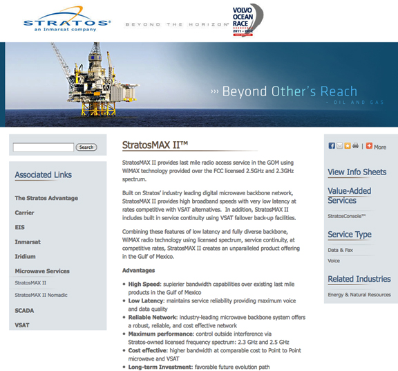 Stratos Global has introduced StratosMAX II Nomadic, a new version of the Company's popular StratosMAX II broadband service offered via the Stratos microwave network for the offshore energy community in the Gulf of Mexico (GoM) region. Since its introduction last year, the WiMAX-based StratosMAX II service has been adopted by several energy companies in the GoM, as it increases the performance of corporate networks offshore. The fixed-site service provides reliable voice communications, broadband (burstable up to 10Mbps) Internet connectivity, Stratos HotSpot WiFi service and a wide range of mobile applications to oil rigs, platforms and offshore vessels. It is available from more than 50 base stations providing coverage of offshore production sites across the GoM. The StratosMAX II advantages of higher speeds and ultra-low latencies over a robust network enable users to achieve maximum functionality at prices comparable to traditional VSAT service.