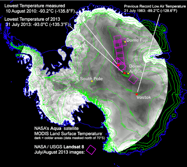 "We had a suspicion this Antarctic ridge was likely to be extremely cold, and colder than Vostok because it's higher up the hill," Scambos said. "With the launch of Landsat 8, we finally had a sensor capable of really investigating this area in more detail."