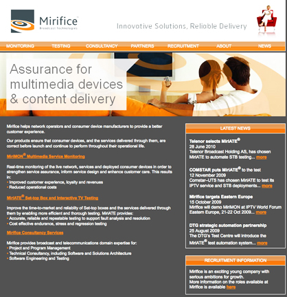 [SatNews] Mirifice announced that European telecommunications and Internet service provider, Telenor Broadcast Holding AS, has selected Mirifice’s MiriATE system to automate the testing of digital television STBs before they are deployed to Telenor’s customers. Automating testing will improve the quality of the STBs, resulting in greater customer satisfaction and lower costs.