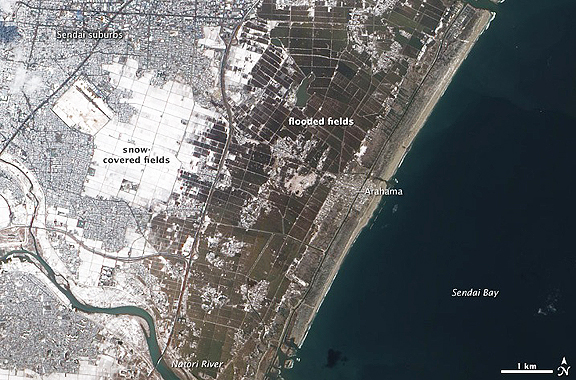 The Advanced Land Imager (ALI) on NASA’s Earth Observing-1 (EO-1) satellite captured this natural-color image of the area on March 18, 2011. One week after the magnitude-9.0 earthquake and resulting tsunami, the fields nearest the ocean were still covered with standing water. It is possible that some areas could remain that way, as the ground level sank along the east coast of Japan during the earthquake. The same tectonic forces that lifted up the seafloor to create the tsunami also caused land to subside on the mainland. Liquefaction of soil and sediments may also have caused settling. The Japan Meteorological Agency warned that the risk of the submergence and flood in these regions has become larger and that coastal residents should "pay special attention to the tide level...especially during the spring tide."