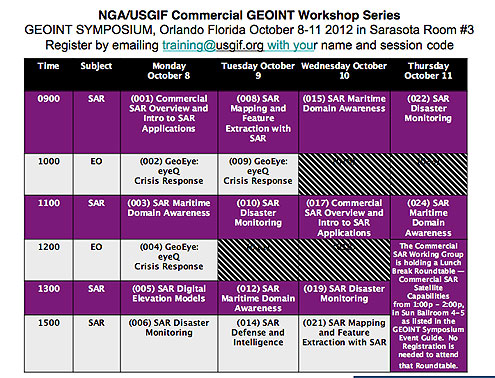 NGA S5 and the USGIF will be holding unclassified Commercial SAR and EO Training Workshops at the GEOINT Symposium October 8-11, at the Gaylord Palms Resort, Sarasota Room 3, in Orlando, Florida.