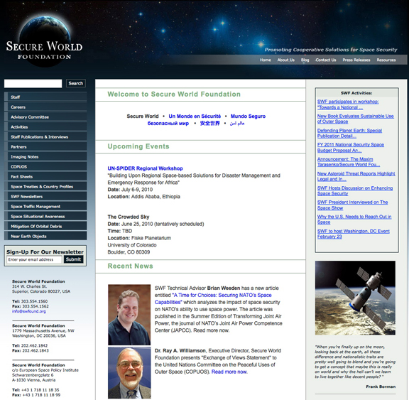 “In all of our work, we actively promote the development of sound policies to support the long term sustainability of outer space activities and the peaceful use of space activities for the benefit of Earth and its peoples,” explained Dr. Ray Williamson, SWF’s Executive Director. Secure World Foundation attended the Committee meeting as a permanent observer. Joining Williamson at the COPUOS session was Agnieszka Lukaszczyk, a space policy consultant for Secure World Foundation. In Williamson’s “Exchange of Views Statement” to the United Nations Committee on the Peaceful Uses of Outer Space on June 11, he detailed SWF’s multi-pronged interests in key areas: