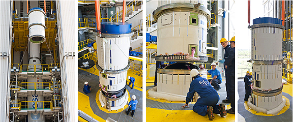 Vega’s Zefiro 9 stage is integrated on the launcher in these photos, beginning with its hoisting to the appropriate level of the ZLV launch site’s mobile gantry (photos at left). In the photos at right, the Zefiro 9 is positioned atop the Vega’s two lower stages. Photos are courtesy of Arianespace.