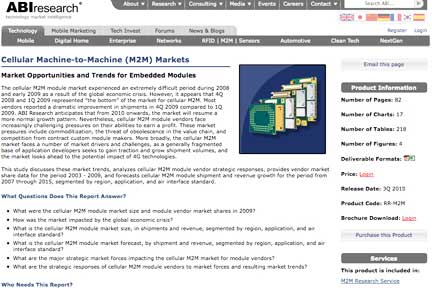 This market assessment is contained in the ABI Research study “Cellular Machine-to-Machine (M2M) Markets” which discusses these trends, analyzes cellular M2M module vendor strategic responses, provides vendor market share data for the period 2003 - 2009, and forecasts cellular M2M module shipment and revenue growth for the period from 2007 through 2015, segmented by region, application, and air interface standard.