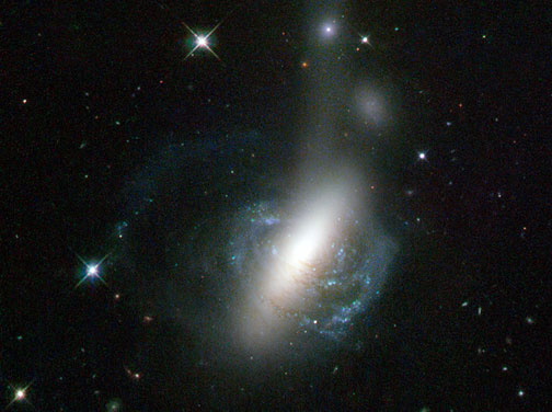 This image from the NASA/ESA Hubble Space Telescope captures an ongoing cosmic collision between two galaxies—a spiral galaxy is in the process of colliding with a lenticular galaxy.