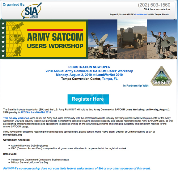 [SatNews] The following industry speakers have been confirmed for SIA’s Third Army Commercial SATCOM Users Workshop, to be held on Monday, August 2, 2010, at the Tampa Convention Center, in Tampa, Florida...