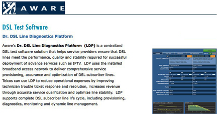 - Aware, Inc. (Nasdaq: AWRE), a leading provider of DSL test solutions, will demo several enhanced software modules for its Dr. DSL Line Diagnostics Platform (LDP) in its exhibition stand at the upcoming IP&TV World Forum which will take place in London from March 22-24, 2011. The modules to be demonstrated include LDP’s DSL Service Predictor and Health Monitor. DSL Service Predictor is a software tool that automatically determines which DSL lines are capable of supporting high-bandwidth IPTV services. DSL Service Predictor computes the DSL line’s IPTV eligibility by collecting and interpreting standard-compliant single-ended (SELT) or dual-ended (DELT) measurements from installed access elements, such as DSLAMs and modems. IPTV operators can use DSL Service Predictor to expand their IPTV coverage area or to evaluate the return-on-investment of upgrading from ADSL2+ to VDSL2 equipment. DSL Health Monitor enhances the IPTV end-customer’s quality of experience (QoE) by detecting emerging problems in the operator’s DSL network or within the customer’s premises before they deteriorate into service interruptions. DSL Health Monitor analyzes the health of IPTV lines against the operator’s DSL performance thresholds and lines with low health scores are automatically identified for proactive troubleshooting.