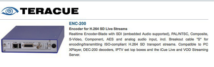Right: Vince Pace - Grupo Voz is using encoder and decoder products from Teracue IPTV Systems. The products are being used for live TV contribution and for the connection of the different broadcast sites. With the ENC-200 encoders and DEC-200 decoders it is possible to send and to transmit video/audio signals in H.264 format over an IP connection. For the contribution and live links, a dedicated 3Mbps network connection is being used. Over this network, V Televisión is transmitting SDI broadcast signals and video feeds. Three DEC-200 decoders are installed in the central office, within the broadcast headquarters in A Coruña. The units are able to output a variety of signals simultaneously. The SDI output can directly be inserted into the broadcast signal workflow, while the Composite output can be used for monitoring. The ENC-200 H.264 encoders are installed in remote delegations as in Santiago de Compostela (Galicia) and in Vigo (Galicia). A third encoder is available for backup and occasional purposes. The units have been selected due to the stable and continuous operation mode, and due to the fact that the compact units operate without any moving parts, as they are fan less and noiseless. The sale and installation has been made by Video Digital through the system integrator NRDmultimedia in Spain, whose team has also handled the complete testing and is delivering the onsite service.