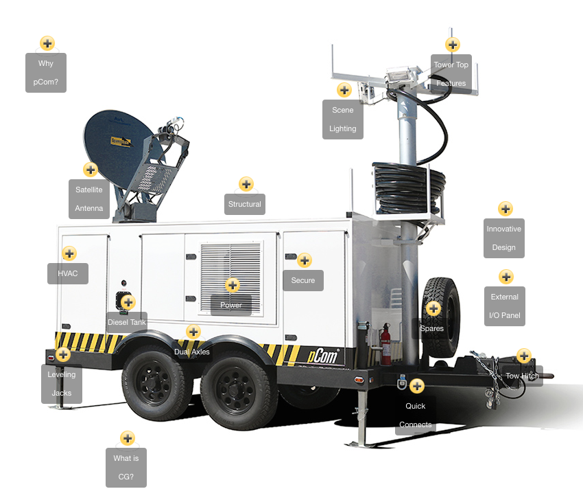 - Featuring the industry leading pCom® XL satellite and cellular communications trailer, ideal for emergency response and remote field communications in the satellite news gathering, Oil & Gas industries and more.
