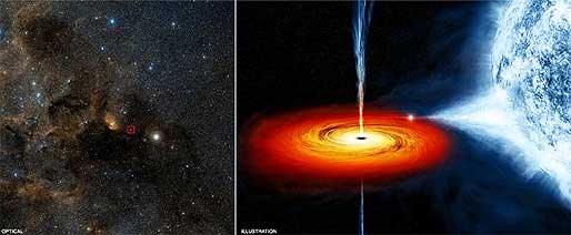 On the left, an optical image from the Digitized Sky Survey shows Cygnus X-1, outlined in a red box. Cygnus X-1 is located near large active regions of star formation in the Milky Way, as seen in this image that spans some 700 light years across. An artist's illustration on the right depicts what astronomers think is happening within the Cygnus X-1 system. Credits: X-ray: NASA/CXC; Optical: Digitized Sky Survey