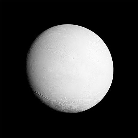 North on Enceladus (313 miles across, or 504 kilometers) is up and rotated 21 degrees to the right. The image was taken in visible light with the Cassini spacecraft narrow-angle camera on Nov. 6, 2011. The view was obtained at a distance of approximately 67,700 miles (109,000 kilometers) from Enceladus and at a Sun-Enceladus-spacecraft, or phase, angle of 21 degrees. Image scale is 2,130 feet (649 meters) per pixel.