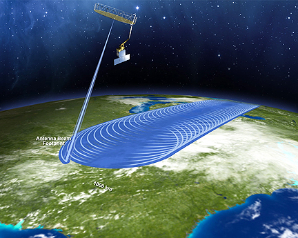 This image shows the swath size cut by the RADAR and Radiometer on SMAP. (JPL artist's concept)