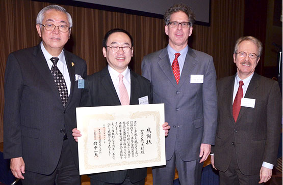 Kiyoshi Takamatsu, Arianespace's Japan representative; Michael Callari, the Vice President of Customer Service at Arianespace; and Dr. Jean-Louis Claudon, Advisor; accepted the accolade from B-SAT President and CEO Kazuo Takenaka.