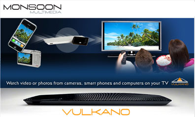 "The Vulkano Lava is the perfect TV companion for consumers who are looking for the ultimate flexibility in enjoying their television programming and personal entertainment content anytime, anywhere," said Colin Stiles, EVP Sales and Marketing at Monsoon. "We believe that not only should you be able to view your television content wherever you want, whether that be on your iPad or on the TV at a vacation home, but we also want you to enjoy videos, music and digital photos captured on your mobile device by streaming them directly onto your big screen TV at home."