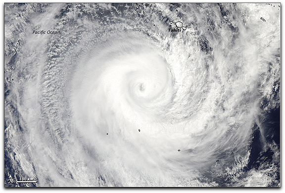 According to the Joint Typhoon Warning Center, Oli had winds of 213 kilometers per hour (132 miles per hour or 115 knots) at 1:40 p.m., local time, when this image was acquired. Forecasters expected the storm to weaken as it continued to move south over cooler waters. At least 3,400 people were evacuated from Tahiti and nearby islands as Oli approached, reported BBC News. The storm’s strong winds damaged homes and power lines. One person died and several others were injured in the storm, said BBC News.