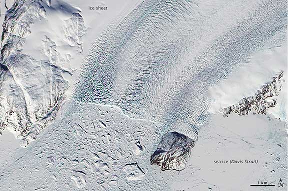 This natural-color image from the Advanced Land Imager on NASA’s Earth Observing-1 (EO-1) satellite shows the heavily crevassed terminus of the Kong Oscar Glacier, one of several glaciers that drain the northwestern part of the Greenland Ice Sheet. Kong Oscar Glacier empties into the Davis Strait, which was choked with sea ice on May 14, 2010, when the image was captured. The smooth surface of the sea ice contrasts with the mixture of small and large icebergs at the mouth of Kong Oscar Glacier; the ice mélange looks like an expanse of Styrofoam blocks.