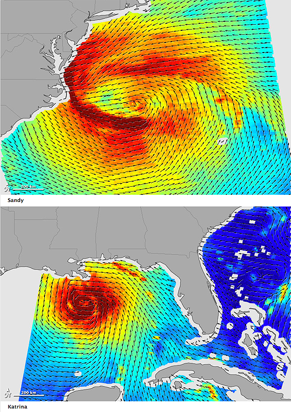 The pair of wind maps above illustrate some of the differences. The map of Sandy’s winds (top), produced with data from a radar scatterometer on the Indian Space Research Organization’s (ISRO) Oceansat-2, shows the strength and direction of Sandy’s ocean surface winds on October 28, 2012. The map of Hurricane Katrina’s winds (bottom) was made from similar data acquired on August 29, 2005, by a radar scatterometer on NASA’s retired QuickSCAT satellite. In both maps, wind speeds above 65 kilometers (40 miles) per hour are yellow; above 80 kmph (50 mph) are orange; and above 95 kmph (60 mph) are dark red. The most noticeable difference is the extent of the strong wind fields. For Katrina, winds over 65 kilometers per hour stretched about 500 kilometers (300 miles) from edge to edge. For Sandy, winds of that intensity stretched 1,500 kilometers (900 miles).