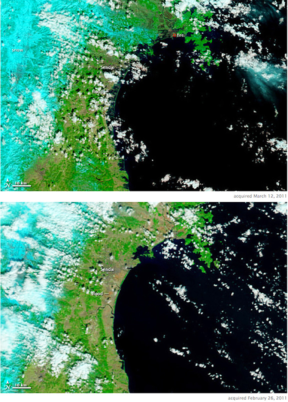 Both images were made with infrared and visible light, a combination that increases the contrast between muddy water and land. Plant-covered land is green, while snow-covered land is pale blue. Clouds are white and pale blue. The paved surfaces in the city of Sendai colors it brown. MODIS detected a fire burning near the shore north of Sendai. The fire is marked with a red box. It is also surrounded by floods. The photo-like true-color image acquired a few hours later shows plumes of sediment washed into the ocean along the coast and a dark plume of smoke near Sendai. Both images are from the MODIS Rapid Response System, which provides twice-daily images of Japan.