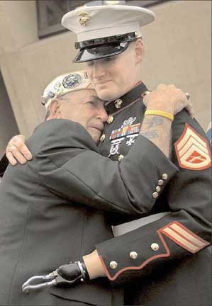 Veterans Day 2004 - World War II veteran and Pear Harbor survivor, Houston James, emotionally embracing Iraq War veteran, Marine Sgt. Mark Graunke, Jr., who lost a hand, leg, and eye when defusing a bomb in 2003.