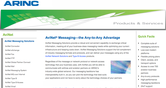 AviNet Mail supports a broad spectrum of IP and legacy airline protocols, as well as multiple message formats such as TCP/IP, CEFACT, XML, SMTP, HTTP, SDLC, P1024A/B, SFTP, MQ, SOAP web services, UN/EDIFACT and X.25/AX.25 FTP. ARINC company information link.