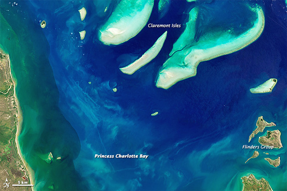 This image of Princess Charlotte Bay in Australia was acquired by the Operational Land Imager (OLI) on Landsat 8 on April 20, 2013, while the satellite was still being calibrated and checked out. The area lies along the east coast of Queensland’s Cape York Peninsula. The scene shows Claremont Isles National Park, where coastal waters are protected as part of Great Barrier Reef World Heritage Site. The islands are important habitat and breeding grounds for seabirds, and they are off-limits to humans.