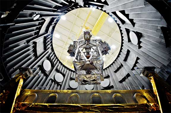 ...tested in the giant thermal vacuum test chamber at NASA's Goddard Space Flight Center, Greenbelt, Maryland. These photos show the OTE (Optical Telescope Element) Simulator or OSIM wrapped in a silver blanket on a platform, being lowered down into a vacuum chamber (called the Space Environment Simulator, or SES) by a crane to be tested to withstand the cold temperatures of space.