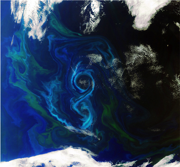 Different types and quantities of phytoplankton exhibit different colors, such as the blues and greens in this image. Earth-observing satellites such as Envisat can monitor these algal blooms. Once a bloom begins, an ocean colour sensor can make an initial identification of its chlorophyll pigment, and therefore its species and toxicity. As the phytoplankton are sensitive to environmental changes, it is important to monitor and model them for climate change calculations and to identify potentially harmful blooms. Envisat’s MERIS instrument acquired this image at a resolution of 300m.