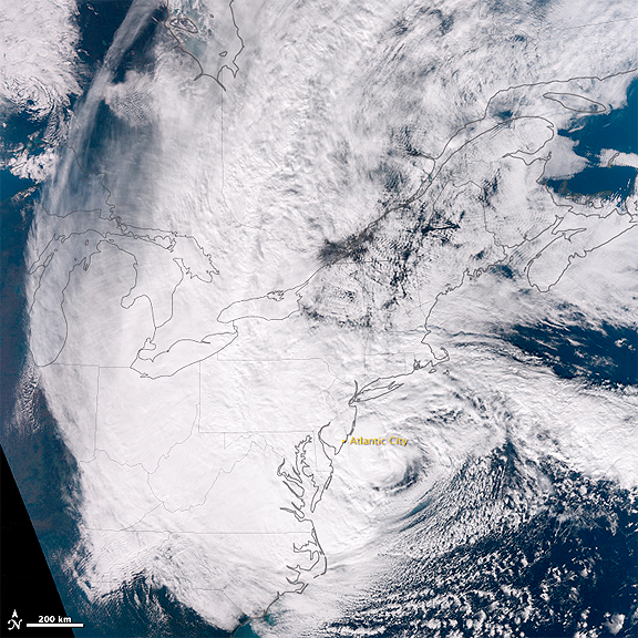 An estimated 60 million Americans were expected to be affected by rain, wind, snow, or ocean storm surges from the storm. The Visible Infrared Imaging Radiometer Suite (VIIRS) on the Suomi NPP satellite acquired this natural-color image of the storm at 1:35 p.m. Eastern Daylight Time (17:35 Universal Time) on October 29.