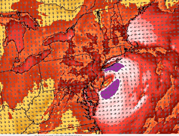 ...Hurriance Sandy may be at 7:00 p.m. this evening, Monday, October 29th. The hurricane is expected to come ashore in central-south New Jersey. In the image below, the dark red indicates winds 50mph in the Washington DC area and purple winds 70 mph+ along the Jersey shore, Long Island and New York City area. It is also being reported by other media outlets that as many as 500,000 citizens are now with power, as of this writing.