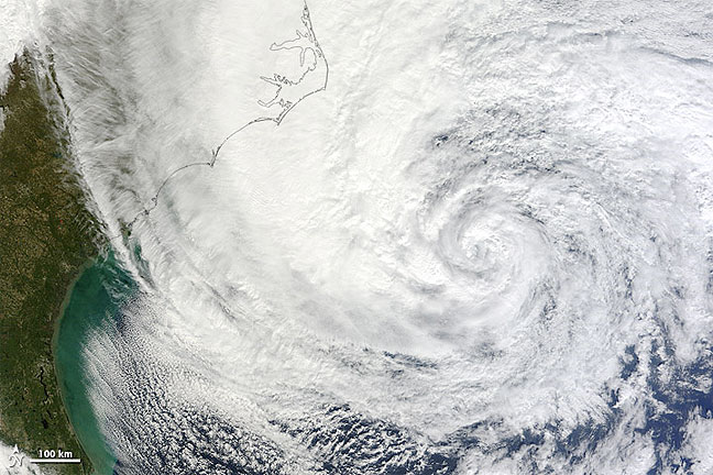 At 11:00 a.m. local time (one hour before the image was captured), the U.S. National Hurricane Center reported that the storm was located at 32.5 degrees North and 72.6 degrees° West, about 250 miles (400 kilometers) southeast of Cape Hatteras, North Carolina, and 575 miles (930 kilometers) south of New York City. Maximum sustained winds were 75 miles (120 kilometers) per hour, and the central pressure was 951 millibars (28.08 inches).