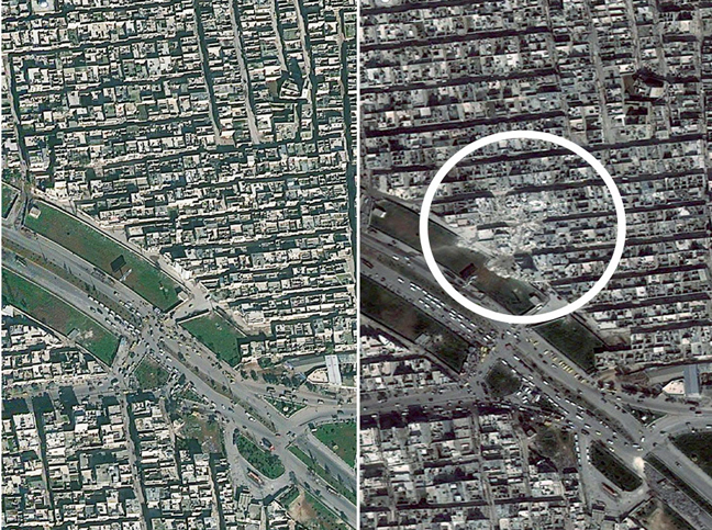 Satellite images show the Jabal Badro area of Aleppo, Syria before, left, and after, right, a ballistic missile strike on the evening of 18 February 2013 which reportedly killed scores of residents. Amnesty claim Syrian government forces have relentlessly and indiscriminately bombarded areas under the control of opposition forces across Syria, with civilians being at the receiving end of such attacks and at the same time also being subjected to abuses by some armed opposition groups.
