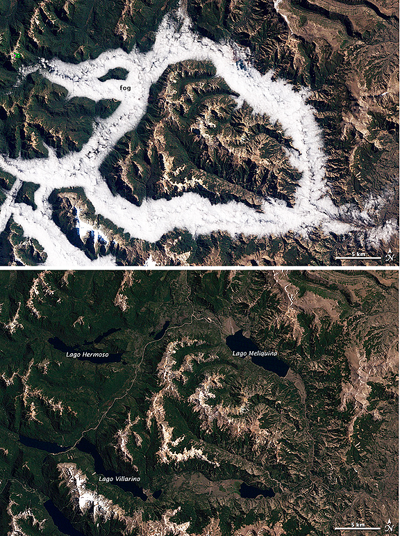 ...scene of fog lingering in valley bottoms of Argentina’s Lake District. The Lake District, a popular destination for travelers due to its dramatic alpine views and numerous glacial lakes, is located in the eastern foothills of the Andes, near the Chilean border. A number of large lakes—including Villarino, Hermoso, and Meliquina—lie below the fog, out of view. The bright green and pink blotch on the upper left of the image is missing data. The lower image, acquired by Landsat 5 on February 15, 2001, shows the same area on a fogless day.