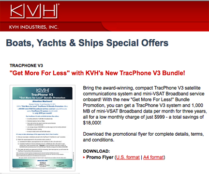 KVH Industries, Inc., (Nasdaq: KVHI) has a special “Get More for Less!” bundle promotion that offers new mini-VSAT Broadband(sm) customers a TracPhone® V3 maritime satellite communications system (a $16,995 value) and a three-year M1000 mini-VSAT Broadband airtime contract, which includes a monthly allotment of 1,000 megabytes of broadband data and offers download speeds up to 2 Mbps for only $999 per month. This limited time promotion lasts until December 31, 2011.