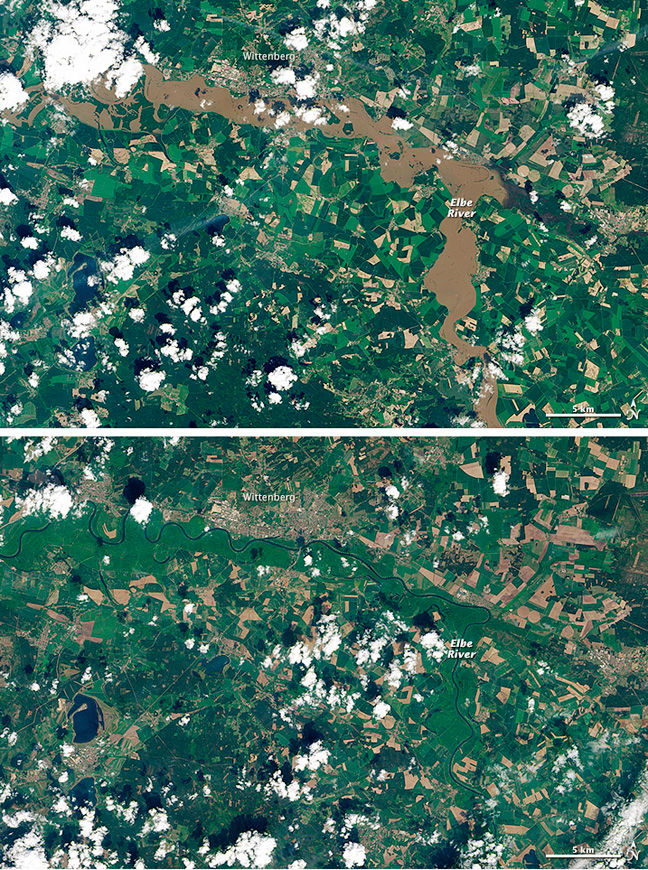On June 7, 2013, the Operational Land Imager on Landsat 8 captured a natural-color image (top) of flooding near Wittenberg, in the German state of Saxony-Anhalt. For comparison, the lower image shows the same area on May 6. Note how the green floodplain around the river in the May image is completely inundated with muddy water in the June image. Puffs of white cumulus clouds are sprinkled across each image.