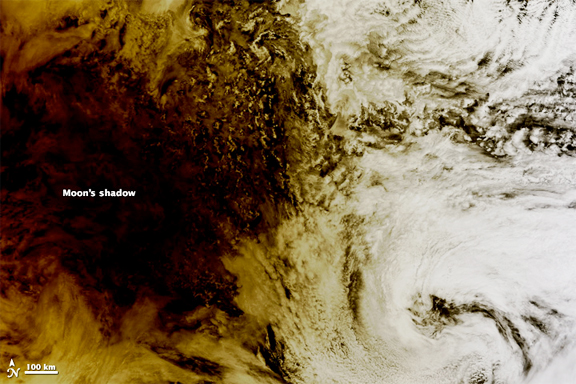 Known as an annular eclipse, the event blocked sunlight across a swath of Earth up to 300 kilometers (185 miles) wide, and the effects were most dramatic across the northern Pacific Ocean. As people on the ground looked up at the sky and saw a ring, the Moderate Resolution Imaging Spectroradiometer (MODIS) looked down and saw the Moon’s shadow racing eastward over Earth’s surface. The MODIS instrument on NASA’s Terra satellite captured this natural-color image of the shadow on the Pacific Ocean at roughly 11:30 a.m. local time on May 21 (23:30 Universal Time on May 20).