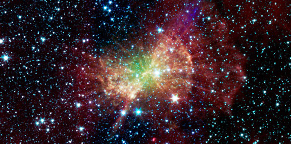This image was made using data from Spitzer's infrared array camera. Blue shows infrared light with wavelengths of 3.6 microns, green represents 4.5-micron light and red, 8.0-micron light.