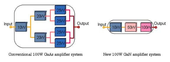 ...gallium nitride high-electron mobility transistor (GaN HEMT) amplifier with a world-leading (as of April 25, 2012) 100W output power for Ku-band (14GHz) satellite communications. The amplifier is expected to contribute to smaller and lighter transmitters for terrestrial stations used in satellite communications. Mitsubishi Electric's high-output GaN HEMT amplifier features a downsized configuration and a low-loss circuit. Output power is double that of the company's existing GaN HEMT amplifier and quadruple that of Mitsubishi Electric's GaAs amplifier. The new amplifier's ability to perform the tasks of four conventional units represents an important contribution to downsize transmitters to one sixth the size of a GaAs amplifier.
