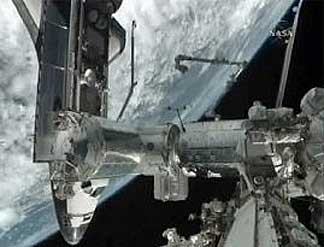 Atlantis delivered the Russian-built Mini Research Module-1 to the station, and the mission's three spacewalks focus on storing spare components outside the station, including a communications antenna, parts for the Canadian Dextre robotic arm, and replacing six solar array batteries.