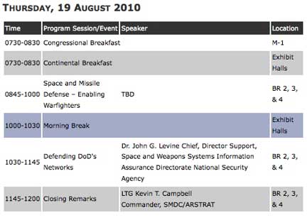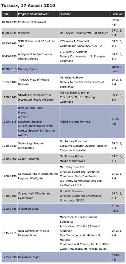 The conference and exhibition is sponsored by the National Defense Industrial Association — Tennessee Valley Chapter, the Air Space and Missile Defense Association, and the Air Defense Artillery Association — Redstone Chapter. On Monday, the agenda includes a golf tournament (in scramble format) starting at 8:30 a.m. at the Hampton Cove Golf Course, with registration from 1200 to 1800 hours and an opening reception from 1730 to 1800... there's also an ice breaker scheduled at the Huntsville Museum of Art, commencing at 1800 hours. The agendas for the other days include...